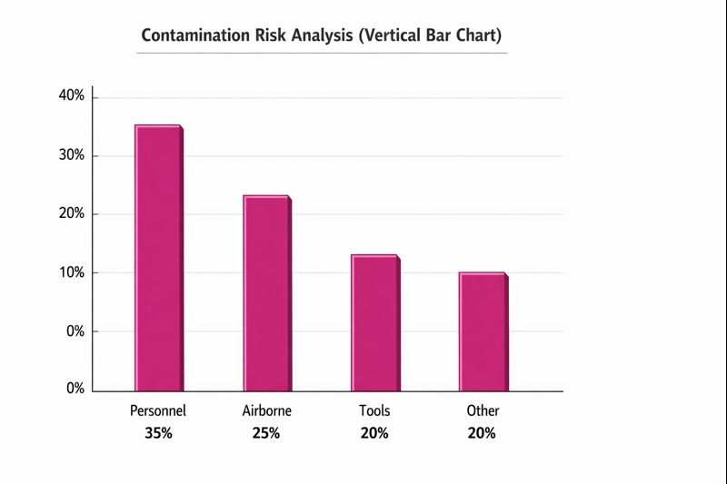 A függőleges oszlopdiagram azt mutatja, hogy a személyzet mozgása járul hozzá leginkább a keresztszennyeződéshez a tisztaterekben, hangsúlyozva a megfelelő ruházatot és törlőkendő kezelést.