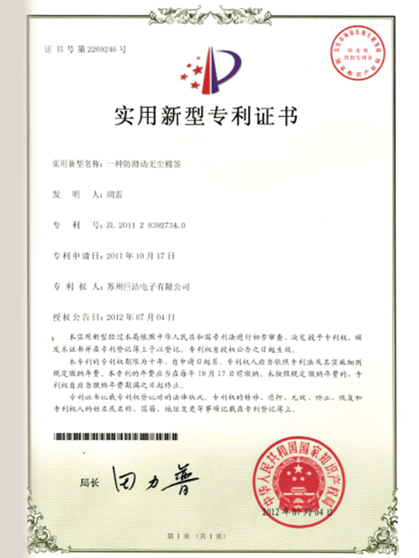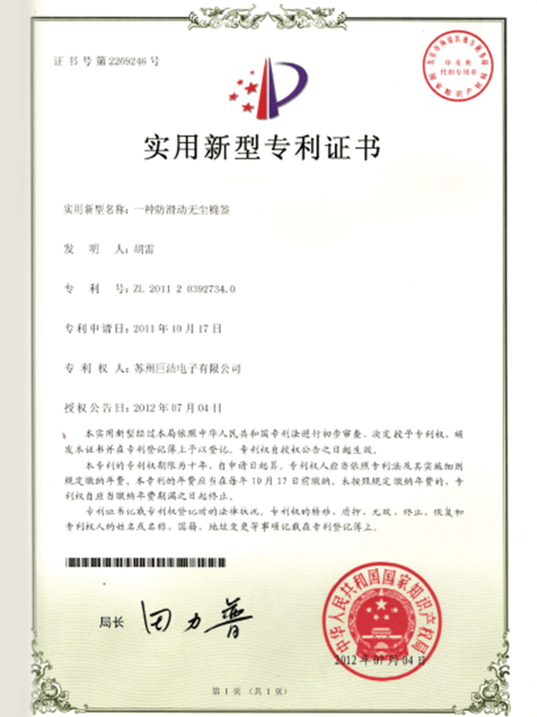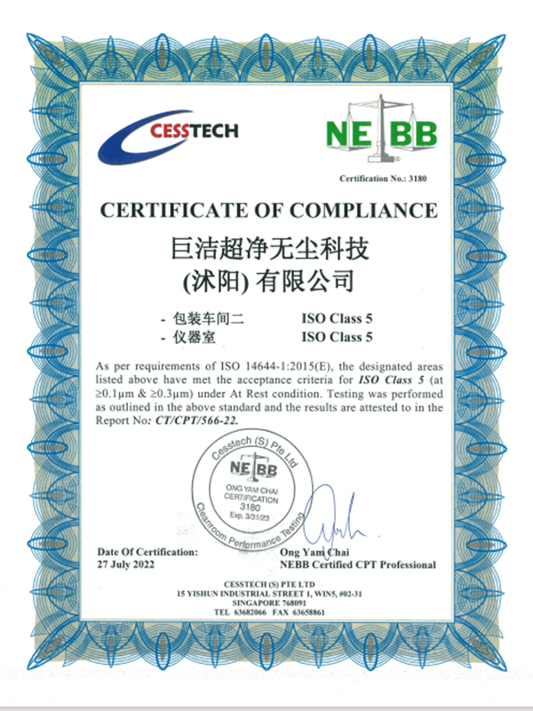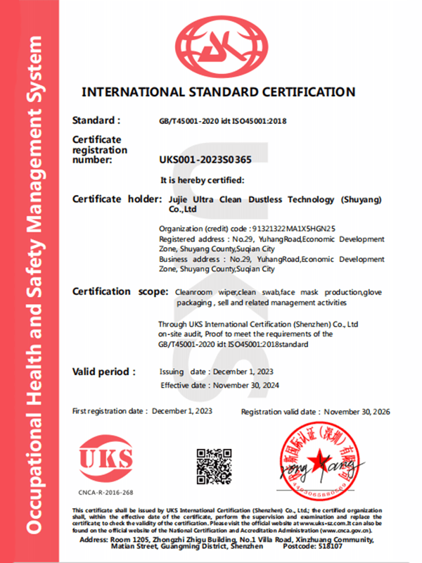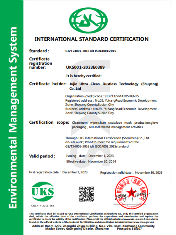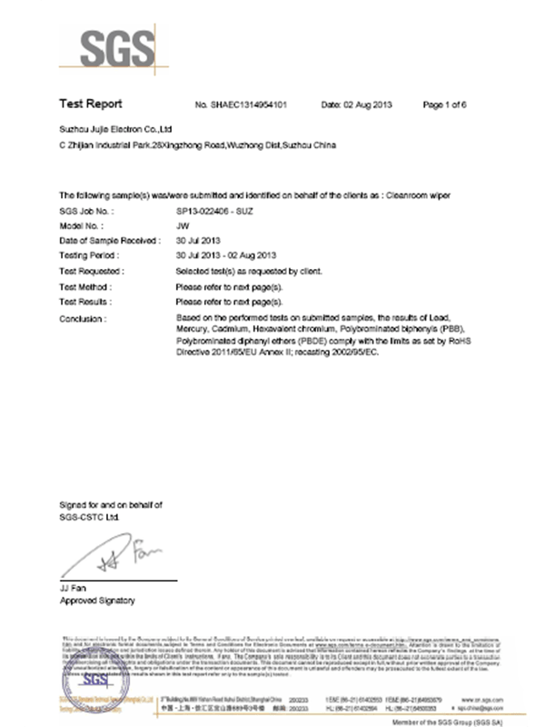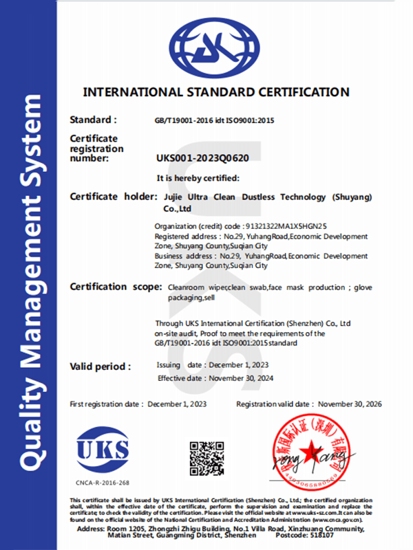 Ellenőrizze, hogy a termék átadta -e a Cleanroom iparági tanúsítást. A Suzhou Jujie Electronics összes fogyóeszköze megfelel az ISO 5/6 osztályú szabványoknak, és harmadik fél tesztelési jelentéseket nyújt.
