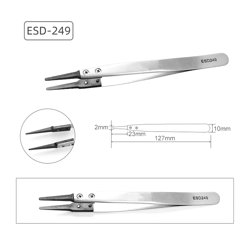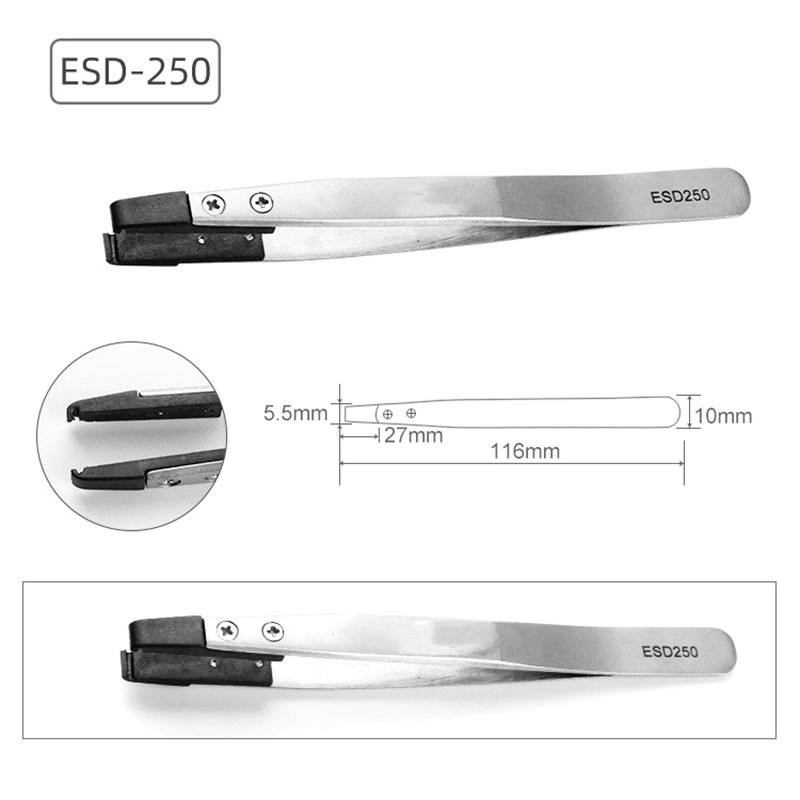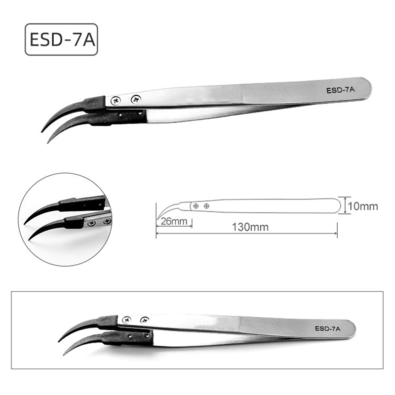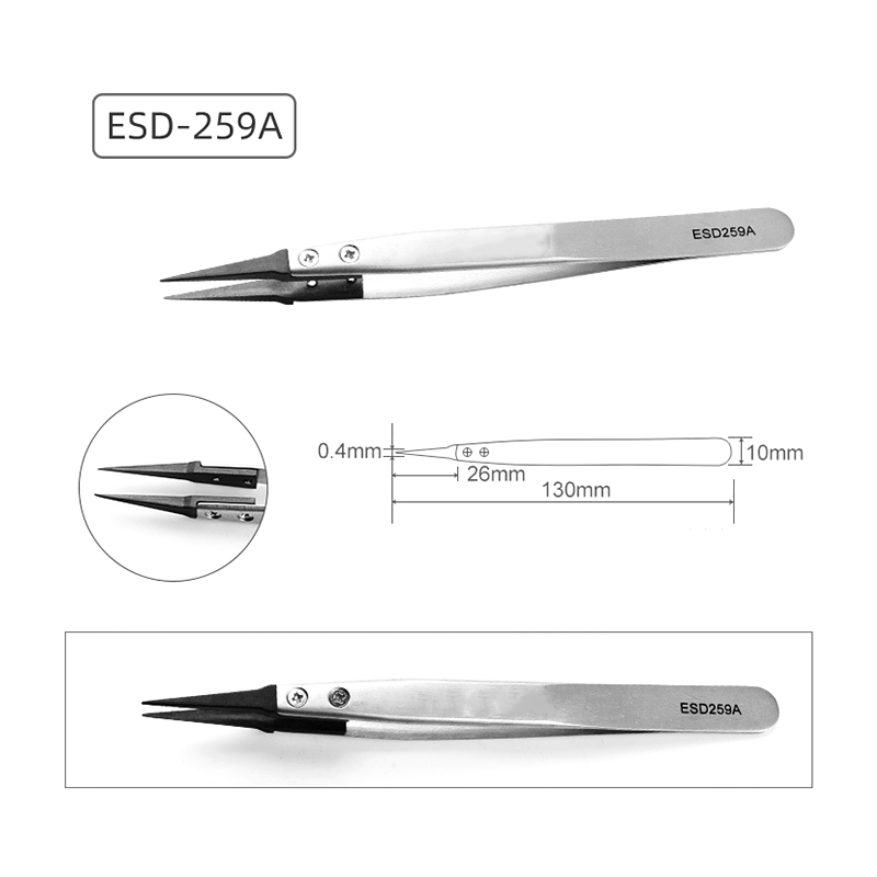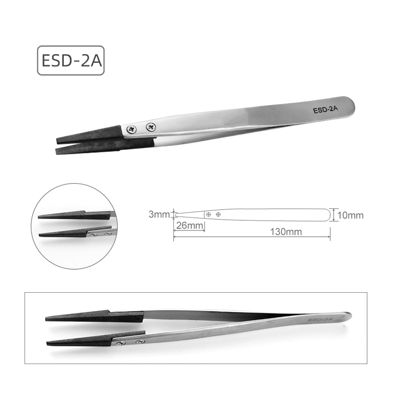 A csipeszek feje szénszál és speciális műanyag keverékéből készül, amely hatékonyan megakadályozhatja a statikus villamosenergia -felhalmozódást, és biztonságos működési környezetet biztosíthat a statikus érzékeny alkatrészek számára.